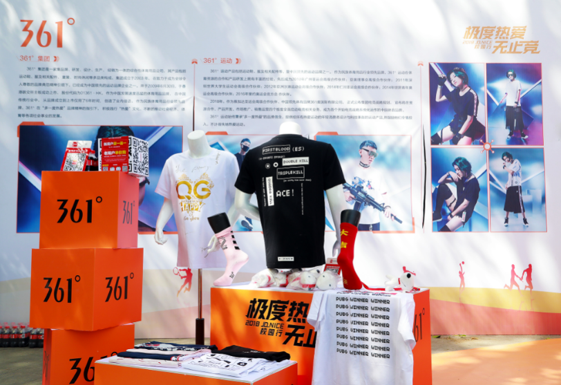 现场的产品展区,展有361°首批电竞系列产品。该电竞系列产品共计15款,其主题标识提取自热门游戏的核心ICON外轮廓,并将电竞中的常用语设计成“666手势”作为核心元素。服装整体采用棉氨面料,在满足人体功能需求的基础上,同时也在应援T女款、王者款及吃鸡款等不同产品中巧妙融入相关电竞元素,服装不仅设计趣味性强,且舒适透气、时尚百搭。