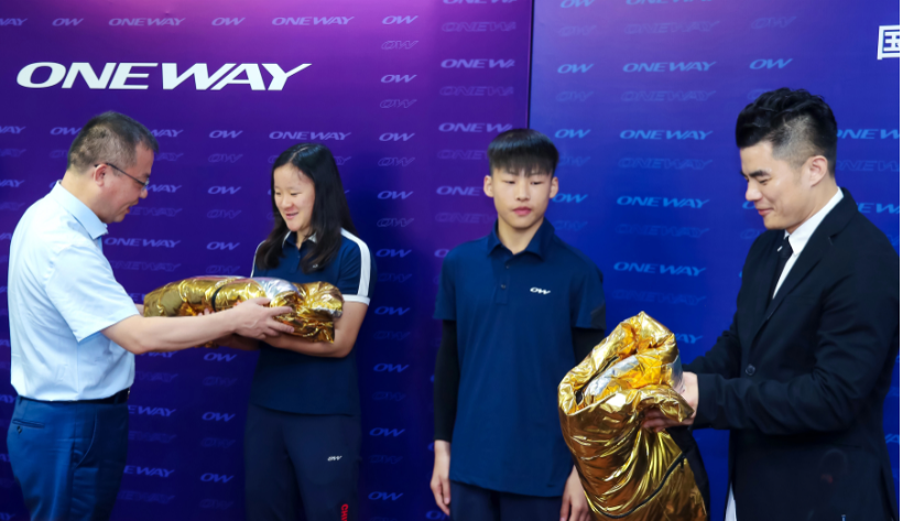 ONEWAY品牌大中华区总经理王建智(右一)与国家体育总局冬管中心常务副主任丁东赠送运动员纪念服