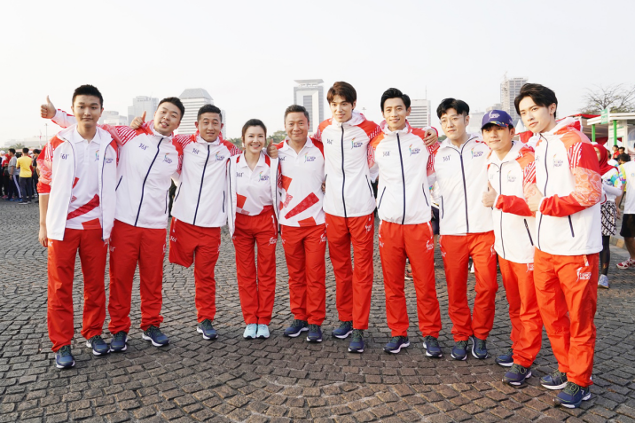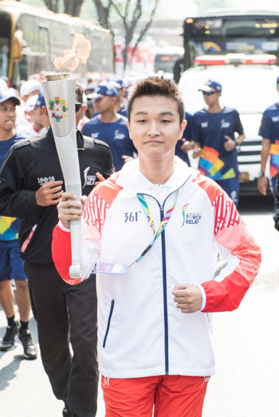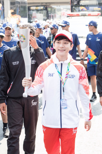 361°品牌代言人兼2018雅加达亚运会推广大使、中国知名歌手及演员魏晨顺利在雅加达完成第18届亚运会火炬传递