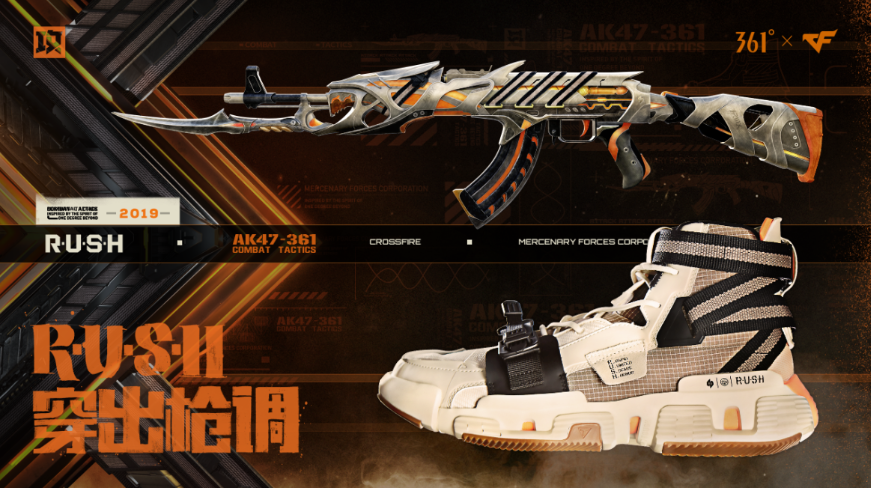 《穿越火线》(简称CF)是由韩国Smile Gate开发,由腾讯代理运营的一款国民级枪战游戏。在本次合作中,穿越火线以玩家最喜爱的枪械TOP2为灵感,为361°创造性地定制了两把永久英雄级武器,并已在游戏中上线;而361°推出的联名“枪鞋”,更是史无前例地将枪械结构融入鞋的设计。
