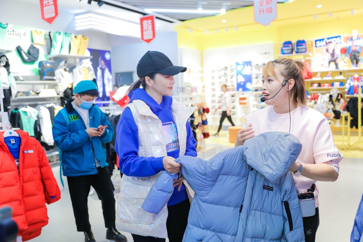 谭维维身着361°幻彩梭织棉马甲,化身明星店长巡店