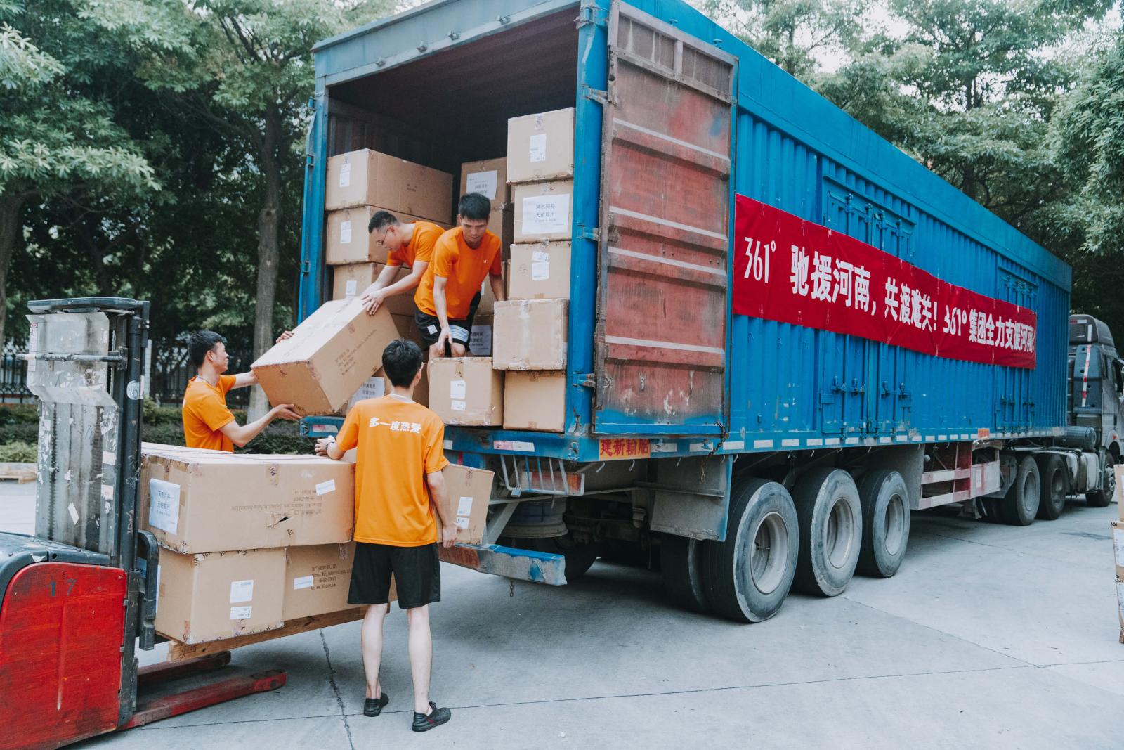 同时,361°集团郑州分公司员工也第一时间向受灾地区支援了消毒用品、果汁、饮用水以及桶装面等紧缺物资。361°郑州分公司终端门店员工更是加入了抗洪救灾的志愿队伍当中,为救灾工作贡献自己绵薄之力,也向受灾地区人民传递“多一度热爱,多一份支援”的精神。