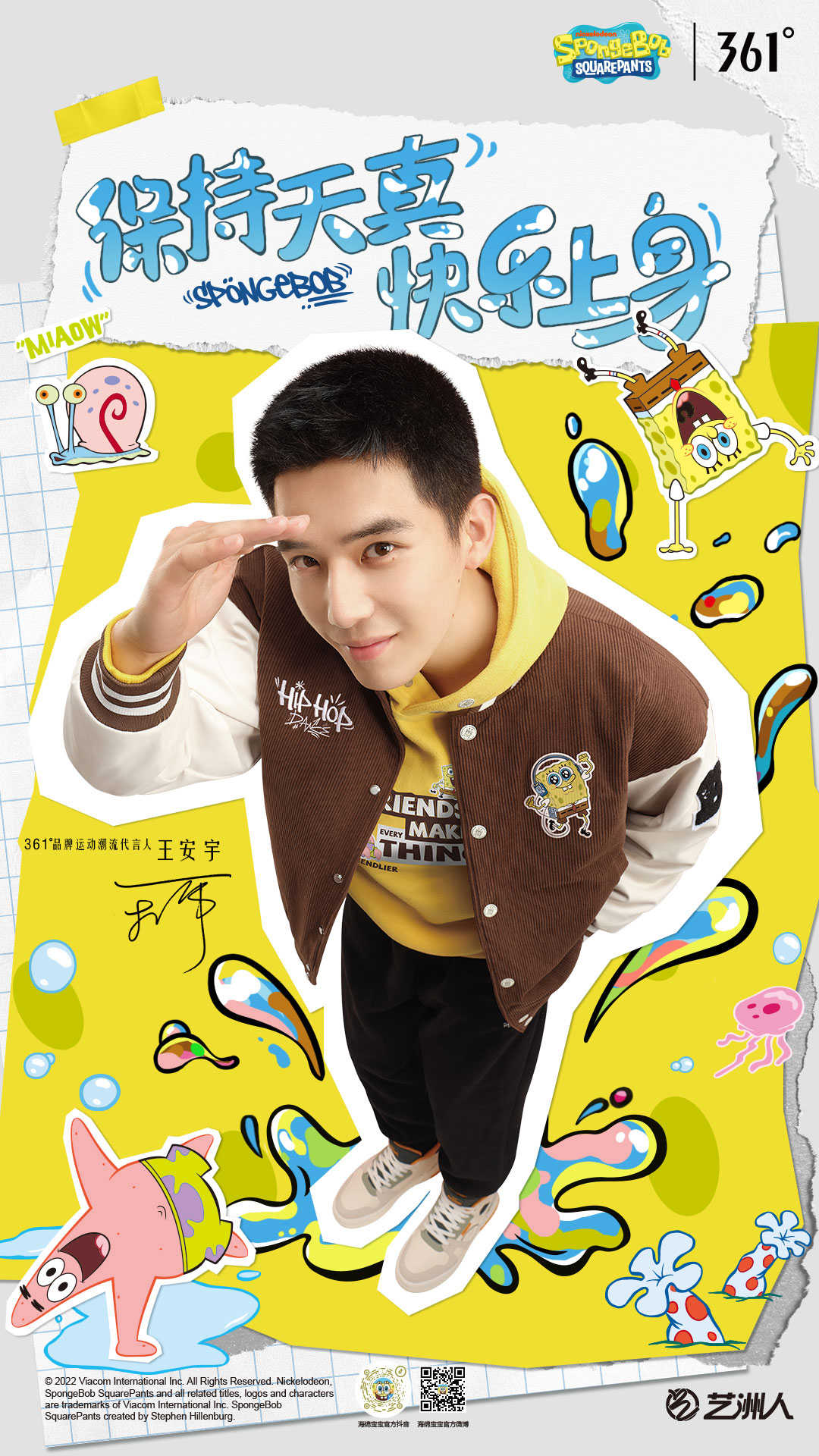 近日,361°与海绵宝宝联名发布了系列设计产品,这也是双方首度合作。该系列新品以“保持天真,快乐上身”为主题,向更多消费人群传递了海绵宝宝的乐观精神与快乐哲学。不仅如此,361°还携手品牌运动潮流代言人王安宇共同发起了「EMO回收站」活动,将跨界联名玩出了新花样。一起去街头涂个鸦,再向快乐敬个礼,上身潮流范儿,当个快乐海绵宝宝吧。
