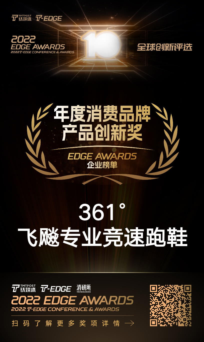 在12月22日举行的2022 T-EDGE全球创新大会暨钛媒体十年致敬盛典上,361°专业竞速跑鞋飞飚荣获“年度消费品牌产品创新奖”,展现了业界对产品科技创新及专业性的高度认可。