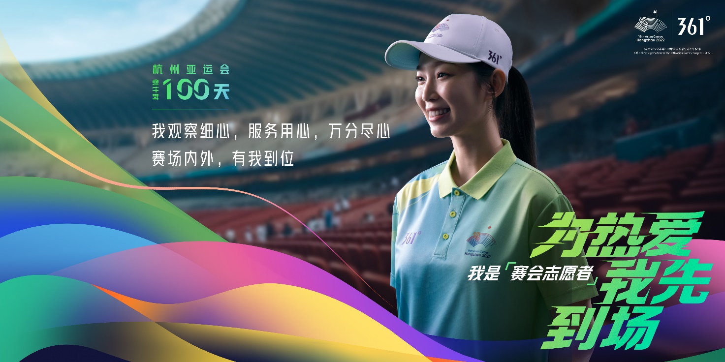 2023年6月15日,杭州亚运会倒计时100天之际,亚运会“四朝元老”361°以“为热爱 我先到场”正式开启亚运时间,并积极投入亚运会前期筹备工作,助力杭州亚运会成功举办。
