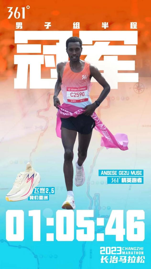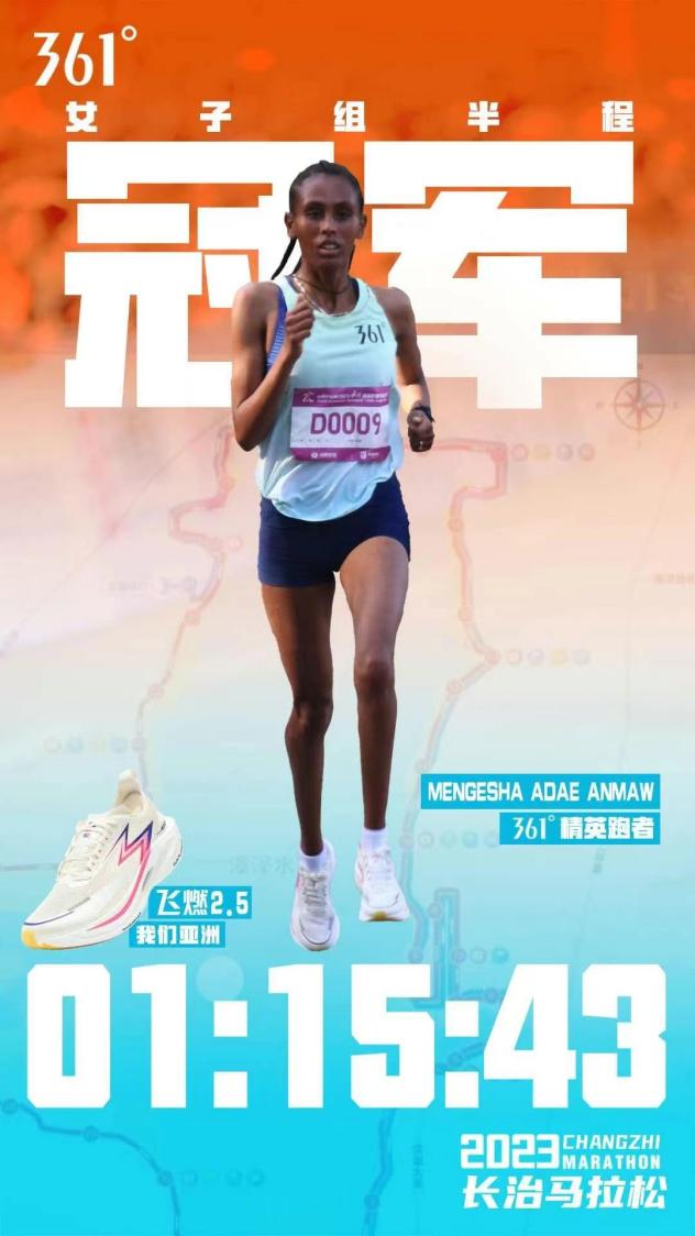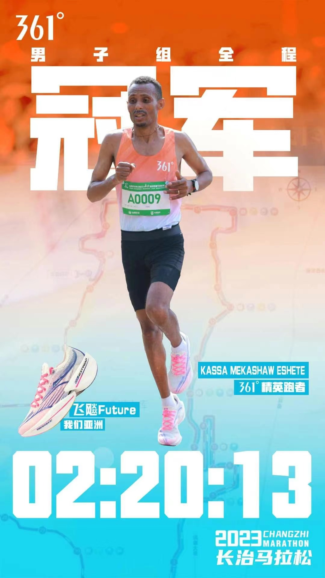 9月17日,2023长治环漳泽湖马拉松赛开赛,361°精英跑者KASSA MEKASHAW ESHETE、MARU CHUCHU ABEBE在最新款的顶级战靴飞飚Future助力下,分别以2小时20分13秒、2小时23分54秒的成绩斩获赛事男子全程组冠、亚军。而ANBESE GEZU MUSE、MENGESHA ADAE ANMAW则依托脚上的361°飞燃2.5,以1小时5分46秒和1小时15分43秒的成绩完成比赛,斩获男子、女子组半程冠军。