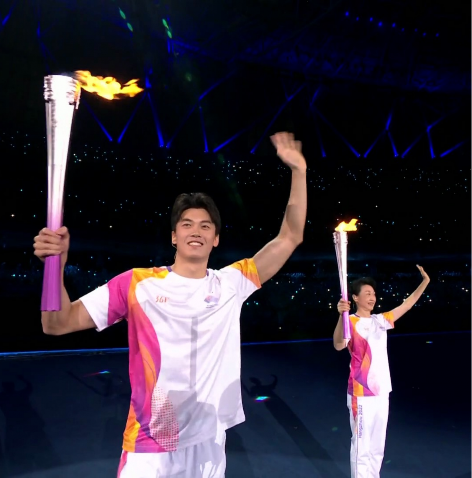 开幕式上,各亚运代表团到场,一袭红白相间制服的羽毛球运动员郑思维和乒乓球运动员孙颖莎代表全体运动员宣誓庄严宣誓,田径裁判员杨中民和射击裁判高佳琦身穿“水光蓝”官方制服站上舞台,举起右拳郑重承诺全力保障赛事的公平公正。2023年9月23日21点28分,万众瞩目之下,六棒火炬手高举圣火接力跑入杭州奥体中心,与代表着千万个线上参与“薪火”传递的数字人火炬手相聚,共同点燃了“大莲花”体育场内“钱江潮涌”主火炬塔。当亚运圣火燃起的那一刻,全场沸腾,人们心中对体育的热爱与激情也随之点亮。作为杭州亚运会官方合作伙伴,361°也以“多一度热爱”为亚运火种的传递保驾护航。