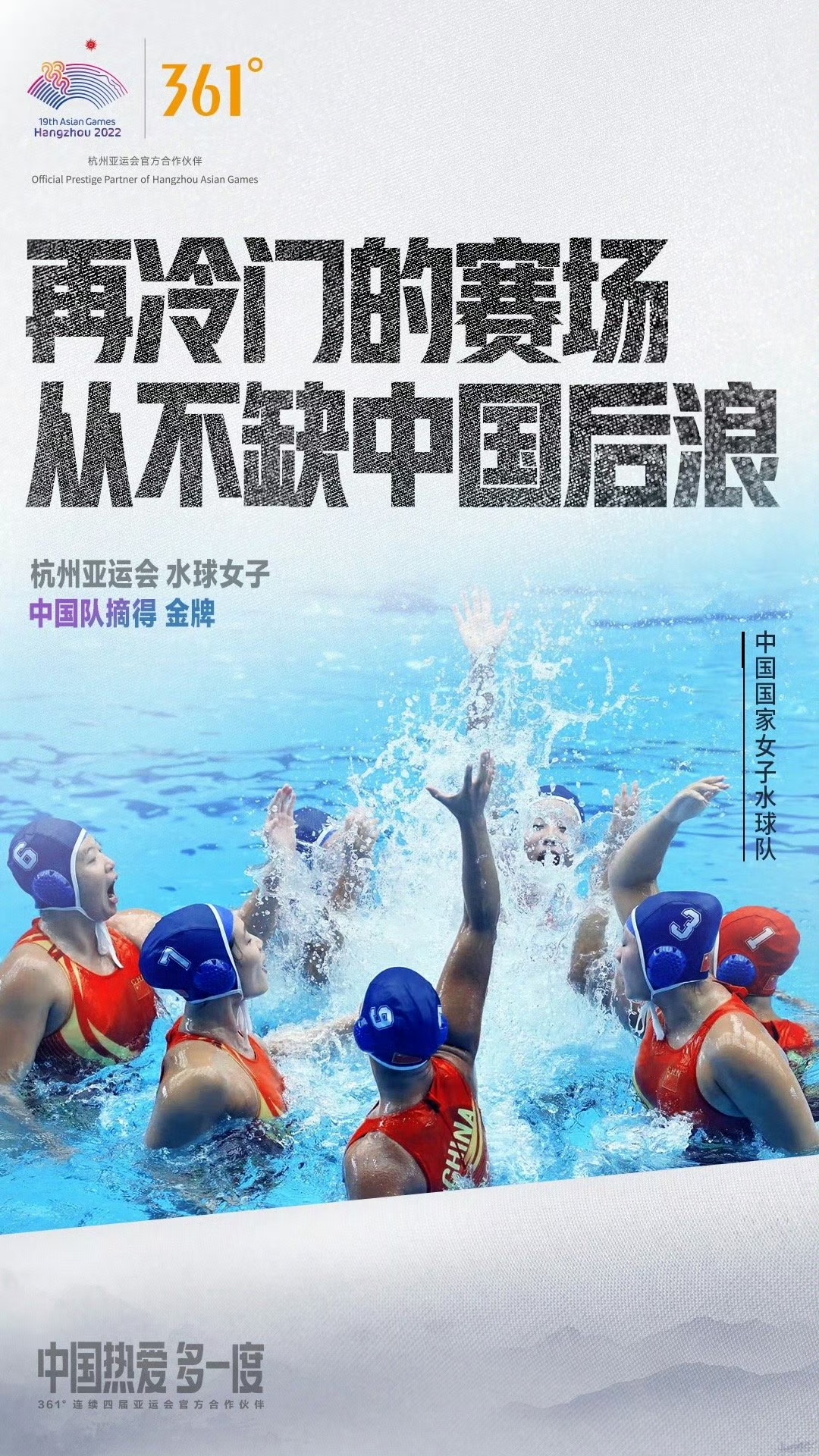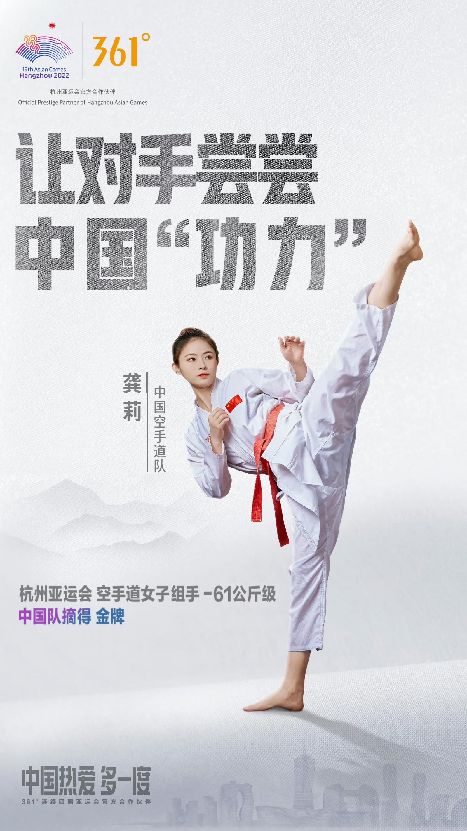在10月1日的女子水球决赛中,361°携手中国国家女子水球队以24比11大胜日本队,实现亚运四连冠。10月5日,中国女篮以74:72绝杀日本女篮,夺得冠军,随后361°官宣中国女篮控卫李缘成为新晋女子篮球代言人。10月6日,在空手道女子组手-61公斤级决赛当中,361°女子运动风尚代言人龚莉代表中国队对战越南运动员阮氏顽,以9比0压倒性优势夺得最后的冠军。冠军的背后,是龚莉顽强的意志和卓越的技术,更离不开361°的全力支持。