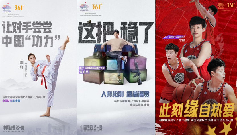 在赛事当中,361°借势女子运动风尚代言人龚莉、电竞运动推广大使朱伯丞(Paraboy伞兵)、女子篮球代言人李缘等多位签约运动员亚运夺金时刻,抢占流量峰值,在赛场战绩传播中实现竞技运动推广与品牌专业形象的双赢。并以此为基础打造了品牌“专业化、年轻化、国际化”战略的实践案例。同时,361°以营销有效性升级、强化产品体验,将亚运会高热度所带来的曝光量成功转化为销售红利,实现销量和品牌口碑的双丰收。