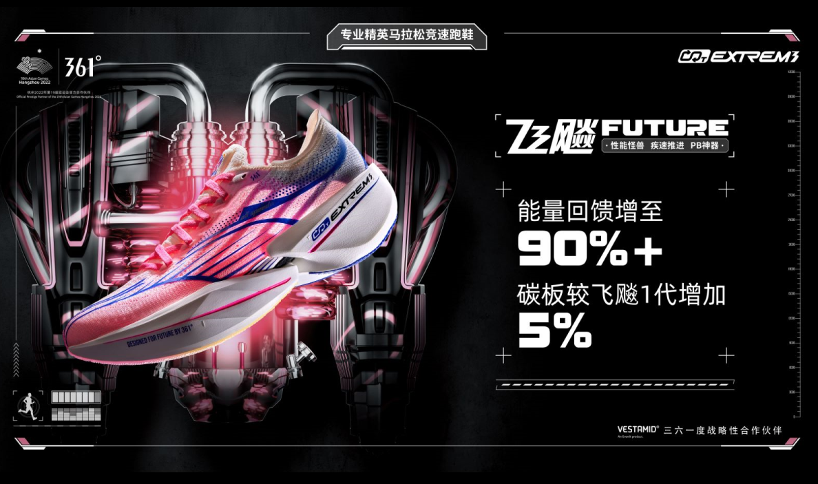 9月,361°推出应用该项科技的专业精英马拉松竞速跑鞋飞飚Future。飞飚Future结合361°国内首创的分离式中底,可通过充分形变释出压力。同时,产品还加入赢创尼龙12粗胚超临界发泡工艺,能量回馈增至90%+,还应用了361°截至目前的最大碳板,为跑者提供更强劲助推力。
