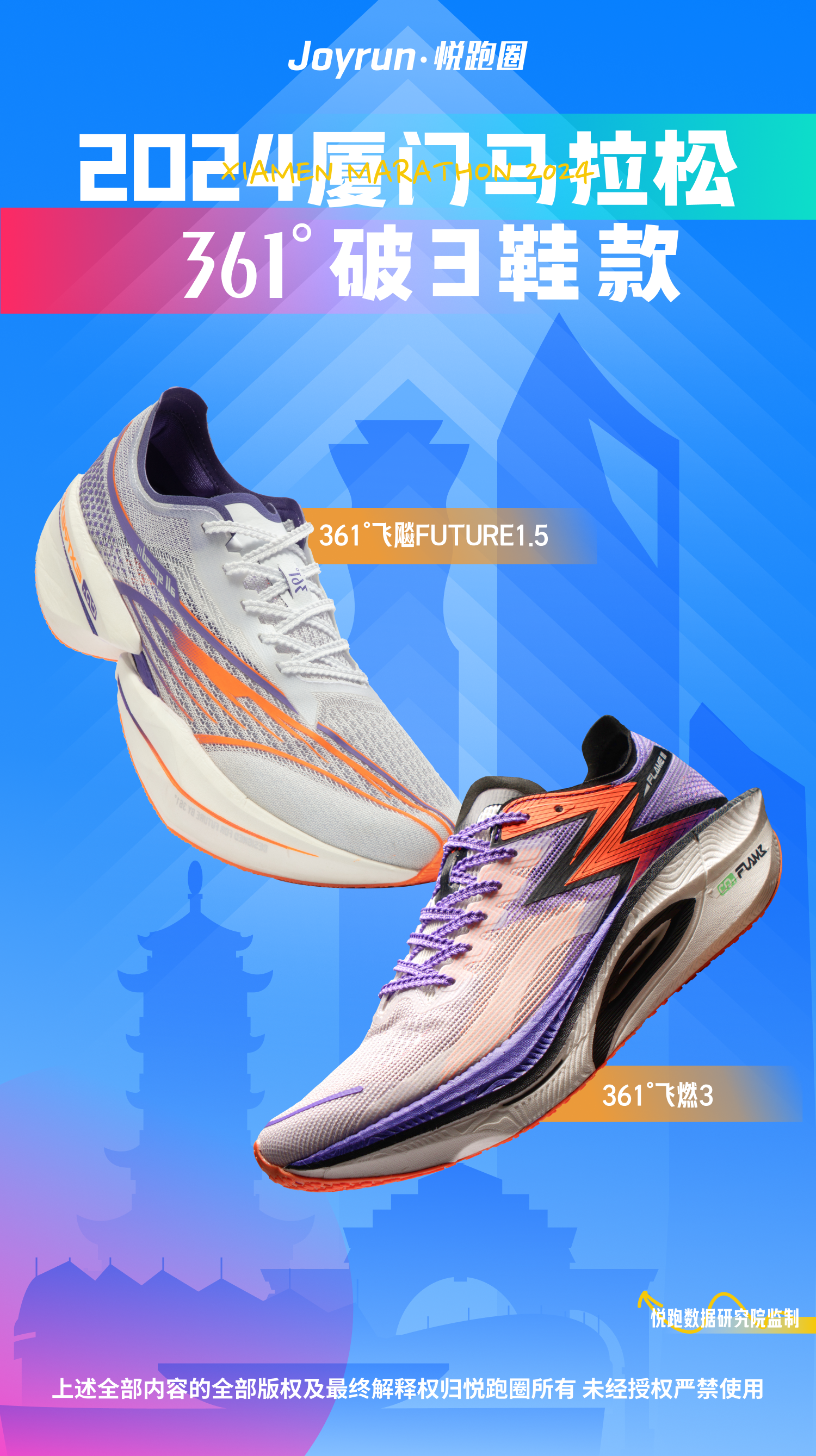 不止是飞燃3,“CQT碳临界跑步专业矩阵”中的飞飚Future1.5,以及马拉松赛道猛兽飞飚Future等多款361°跑鞋都在厦马期间备受跑者好评,均位列破3跑鞋穿着率排行榜TOP10,足见实力。据第三方权威媒体数据显示,厦马期间,破3跑者361°跑鞋穿着率直接翻倍增长,占比高达17.2%。