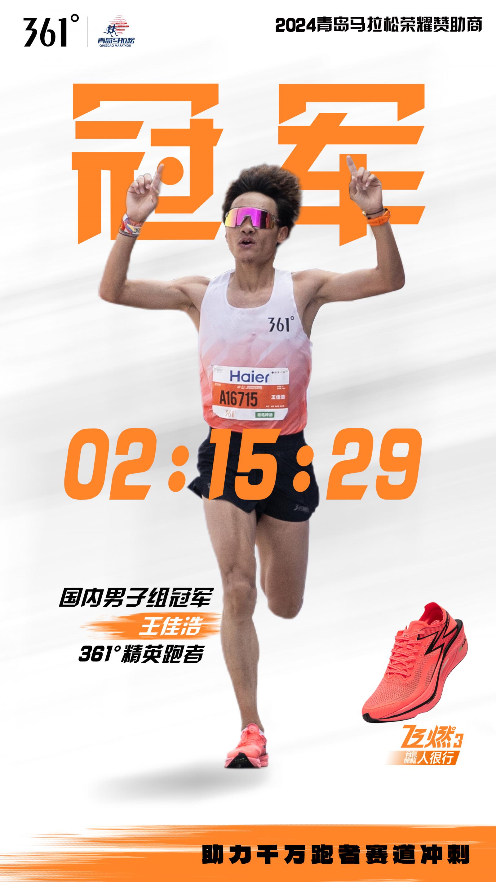 在本届比赛中,361°精英跑者Seroi Anderson Saitoti以2小时13分34秒斩获全程男子组冠军并刷新赛会纪录,361°精英跑者王佳浩上脚飞燃3以2小时15分29秒获得马拉松男子组国内冠军。