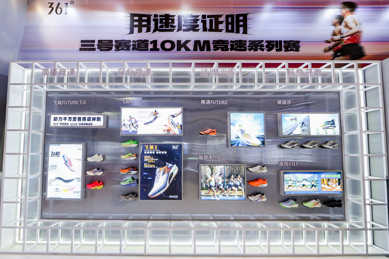361°还展示了面向场地训练的飚速3Pro,独特尼龙玻纤设计,拥有抓地超耐磨、稳定推进的出色表现,堪称“金牌体测教练”。而畅快开跑矩阵的疾风CQT集“弹”、“稳”、“透”三大特点于一身,满足进阶跑、健身跑、日常穿着等多种用户需求。
