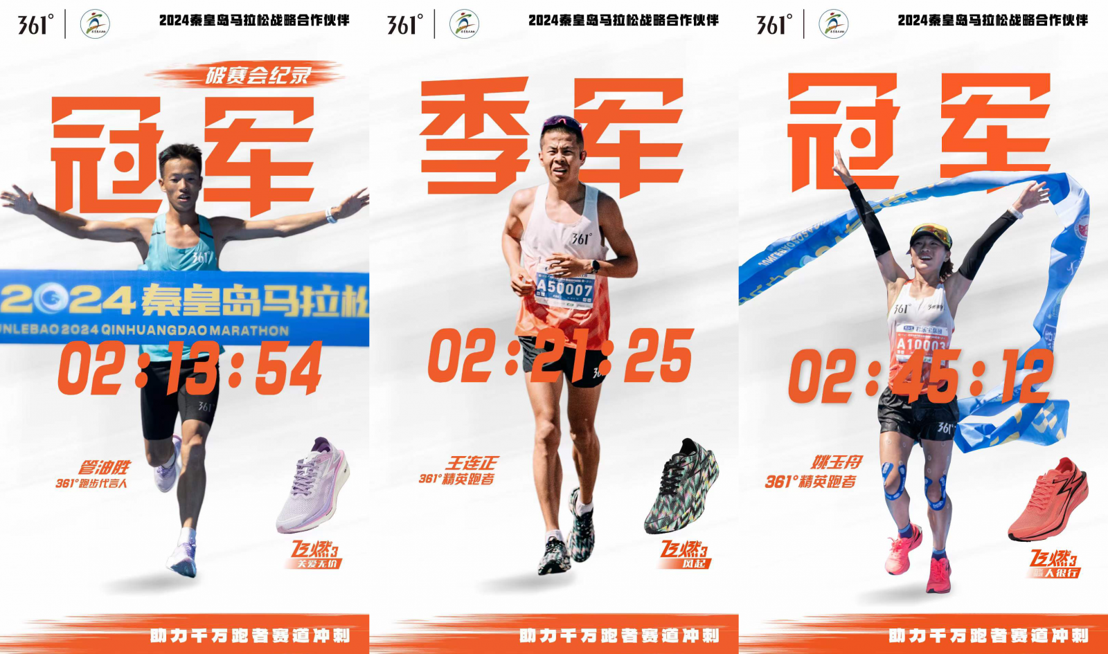 经过多年在跑步领域的持续深耕,361°构建了顶级竞速、专业竞速、场地训练、畅快开跑四大专业跑步产品矩阵,无论是日常路跑的小白,还是专业的马拉松选手,都能找到适合自己的最佳运动装备。此次秦皇岛马拉松上,361°跑步代言人管油胜上脚飞燃3专业马拉松竞速跑鞋,以2小时13分54秒的成绩夺得男子组冠军并刷新尘封8年之久的赛会纪录,与361°精英跑者王连正、姚玉舟、张水华、冯丹一起包揽了男女组前三,显现出了361°专业马拉松竞速跑鞋的强悍实力。