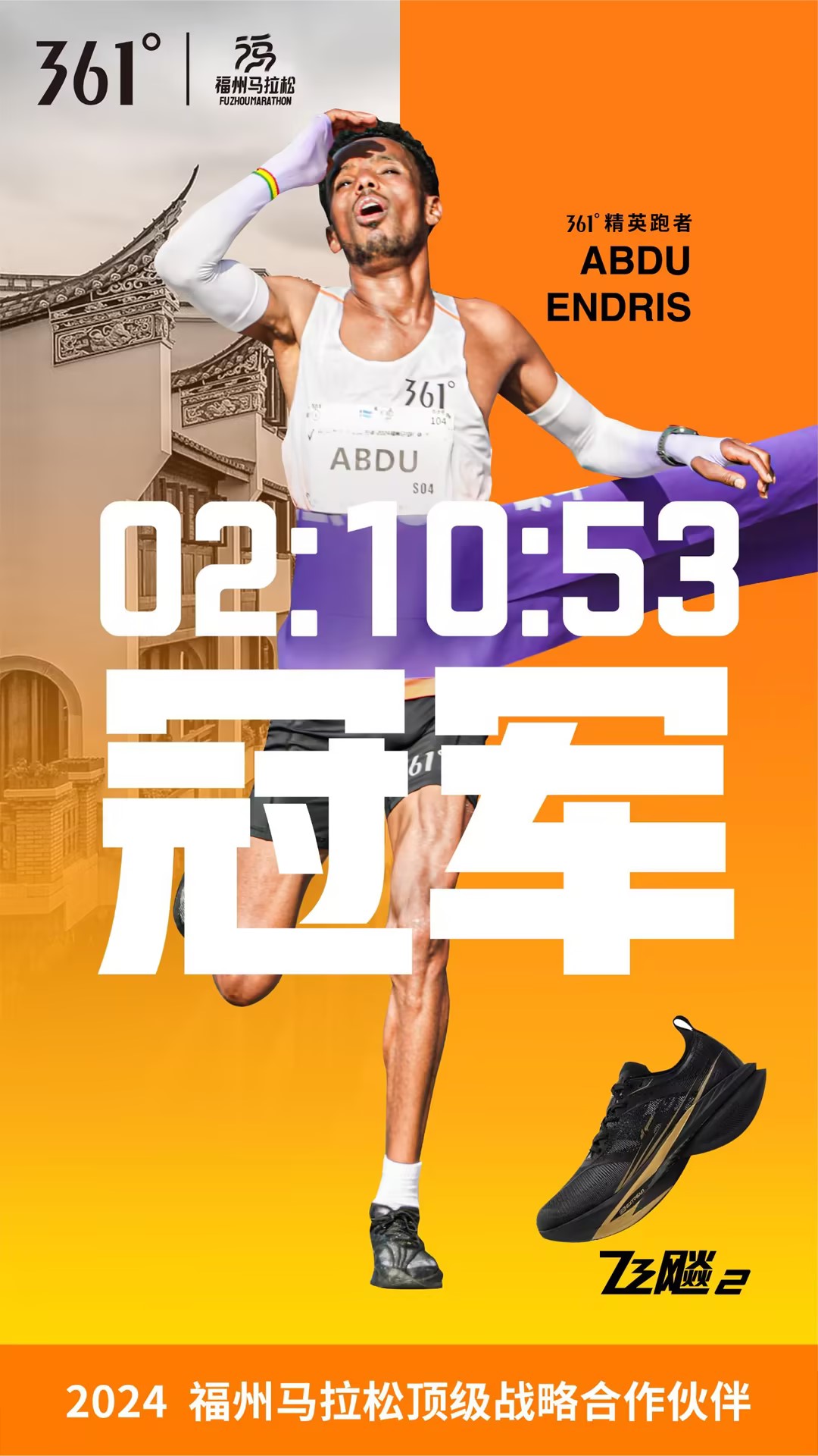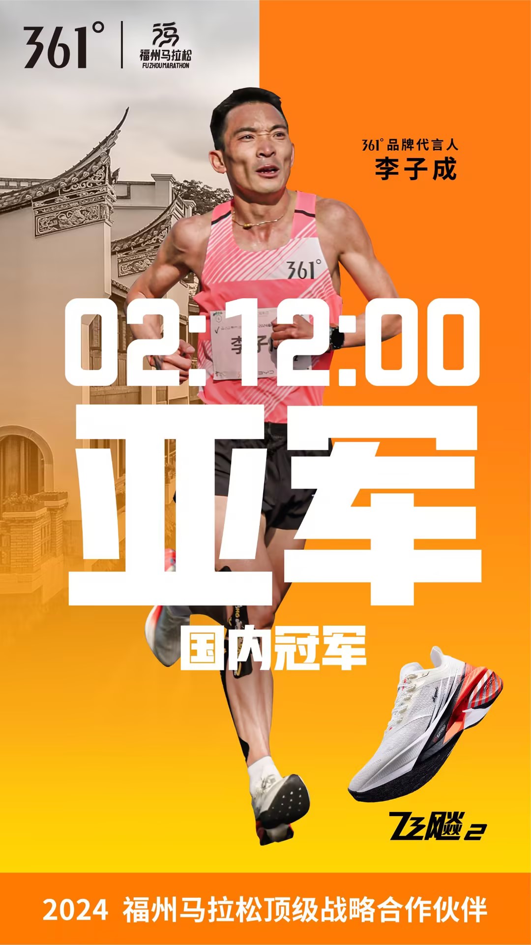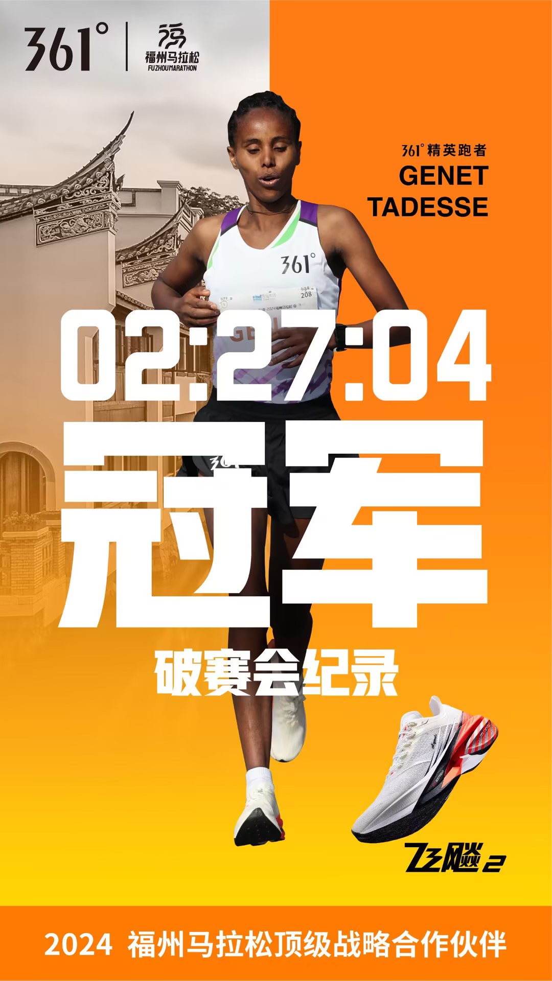 最后,经过赛场激烈角逐,361°精英跑者ABDU ENDRIS与GENET TADESSE包揽2024福州马拉松男女子冠军,GENET TADESSE更以2:27:04的成绩打破女子赛会纪录。不仅如此,361°跑步代言人李子成也获得了男子组亚军、国内冠军的优异成绩。在不久前的柏林马拉松上,飞飚2就以卓越的赛道性能助力361°跑步代言人GOLA刷新361°大满贯赛事女子最佳记录,同时也是361°品牌首次进入大满贯赛事前10。在本届福州马拉松,飞飚2再次用成绩展现其速度血脉,成为精英跑者的PB神器。